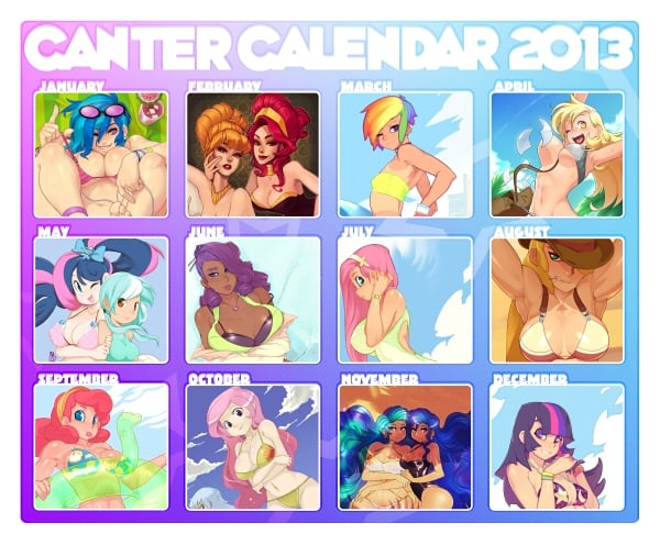 Canter Calendar 2013 is a fan created calendar featuring sexy human ladies of equestrian origin. Featuring art by Doxy, J.Axer, Miu, Yano, Shepherd0821, ManiacPaint, Ehryel